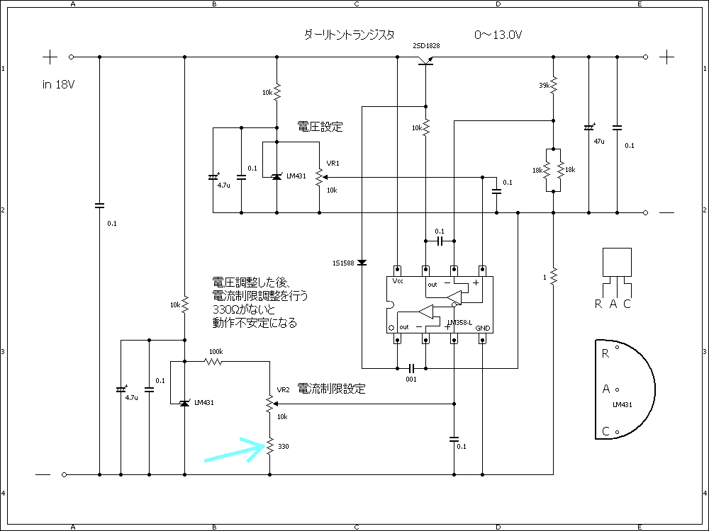 AC90Vのとき定格負荷、整流後電圧18.1V AC110Vのとき無負荷、整流後電圧26.2V 可変電源回路 ![]() 可変型シャント・レギュレータ「LM431」が発振したので「0.1μF」「4.7μF」を追加して発振対策 LM358発振対策 3ピン・5ピンを「0.1μF」でアースに落とす ![]() |