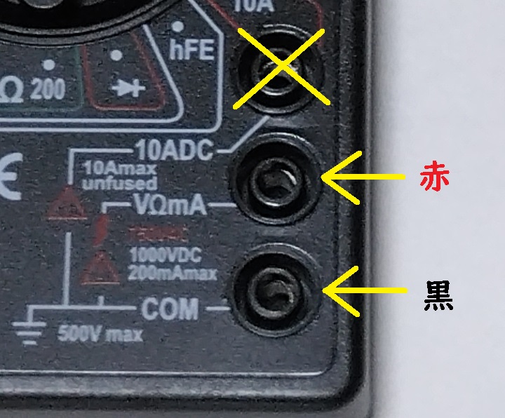 赤 テスターリード +プラスに接続 黒 テスターリード -マイナスに接続 「赤」テスター棒は「ⅤΩmA」に接続 「黒」テスター棒は「COM」に「赤」を接続