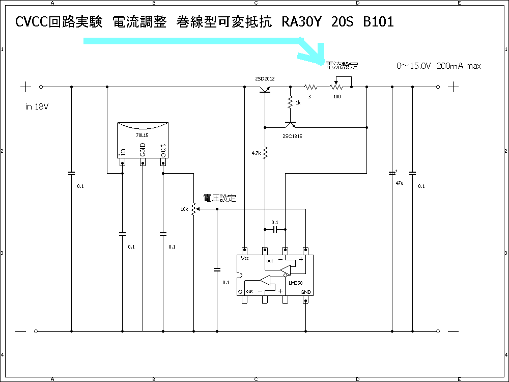 巻線可変抵抗 RA30Y 20S B101(100Ω)を使用 電流 約10~200mA可変 LM358を使用して0~15V電圧可変 電流検出抵抗に巻線型可変抵抗を使用して電流をコントロールします。 メリットはプラス側で電流検出しているのでマイナスを共通化できます ![]() 巻線可変抵抗 RA30Y 20S B101(100Ω)に流せる電流は仕様では2.5W 単純に P=I×I×R なので 流せる電流は √(2.5/100) ≒0.158A 連続動作なら0.15Aまでなら流せそう?(メーカーに確認しないとわかりませんが・・・) 短時間なら0.2Aでも大丈夫??? 巻線可変抵抗 RA30Y 20S B101(100Ω)は高価(近所のパーツ店で1200円前後)ですが この電流制限回路なら「マイナス側で電流を検出しない」ので便利です。 |